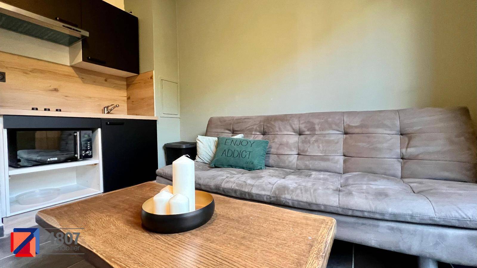 T1 MEUBLE SALLANCHES RESIDENCE DU MONT BLANC - Appartement en rez de chaussée à deux pas du centre ville avec extérieur F1 de 33m2 au sol avec l'aménagement d'une dépendance en souplex en guise de chambre. Composé d'un hall avec placard, une terrasse , d'une chambre en soulpex , une cave et un parking privatif.