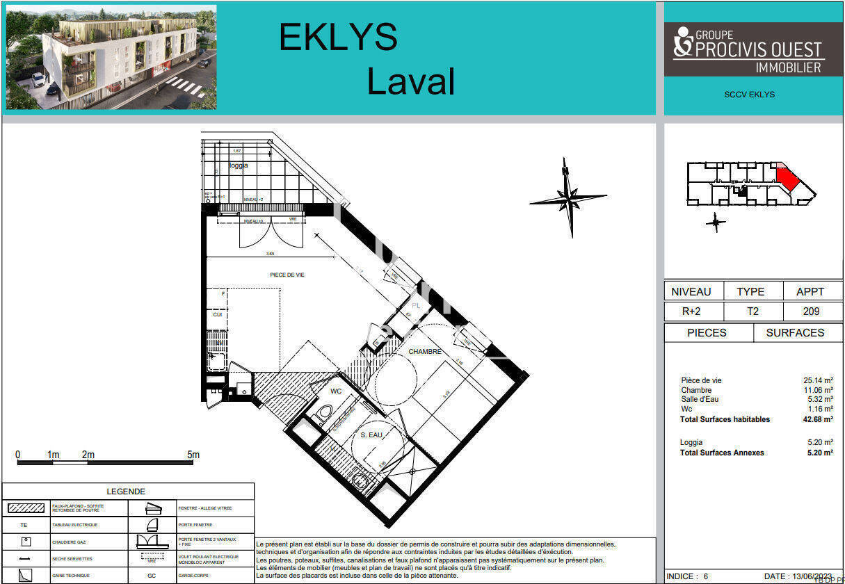 L8287-01. A LAVAL - Quartier Gare, IMMO DE FRANCE vous propose cet appartement 2 pièces de 42.68m² située au 2ème étage dans la nouvelle résidence EKLYS. Il se compose d'une entrée, d'un salon avec cuisine aménagée et équipée (plaque, four, hotte), d'une chambre avec placard et salle d'eau privative, WC.