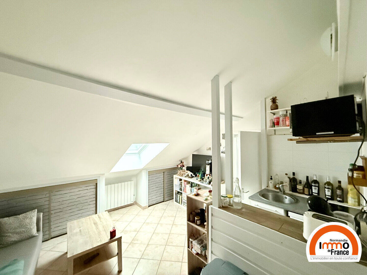 F2 MEUBLE de 15,88 m² au sol, au 3ème et dernier étage, comprenant : séjour avec rangements sous combles, coin cuisine avec comptoir US équipé d'un réfrigérateur + plaque de cuissons, 1 grande chambre avec rangements sous combles, salle de bains avec machine à laver, 1 mezzanine.