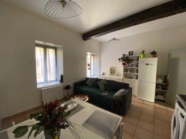 Le bien se compose d'une entrée, une pièce de vie, une cuisine équipée (plaques de cuisson, four), une chambre, une salle de bains et un WC. Double virage et volets électriques