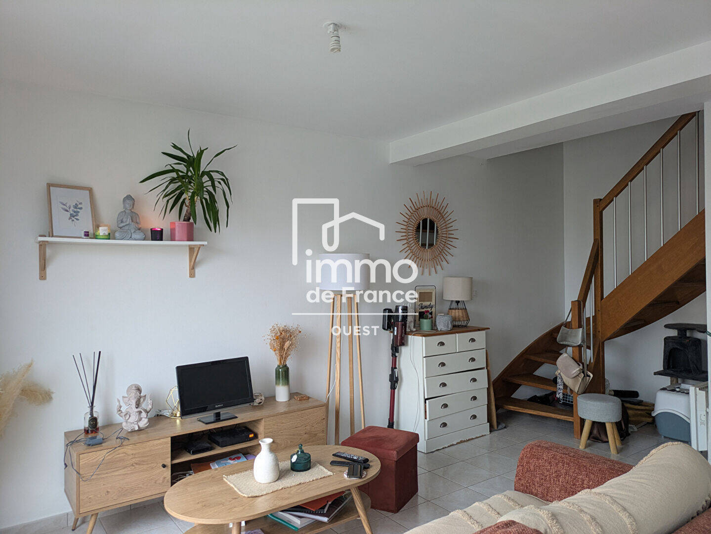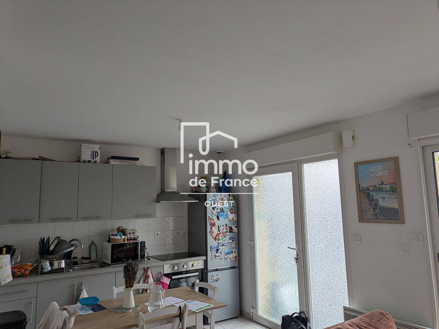 M6570- Au Rdc : séjour avec coin cuisine aménagée et équipée (hotte et plaques vitrocéramiques, placard, cellier, WC, escalier, terrasse à usage privatif.