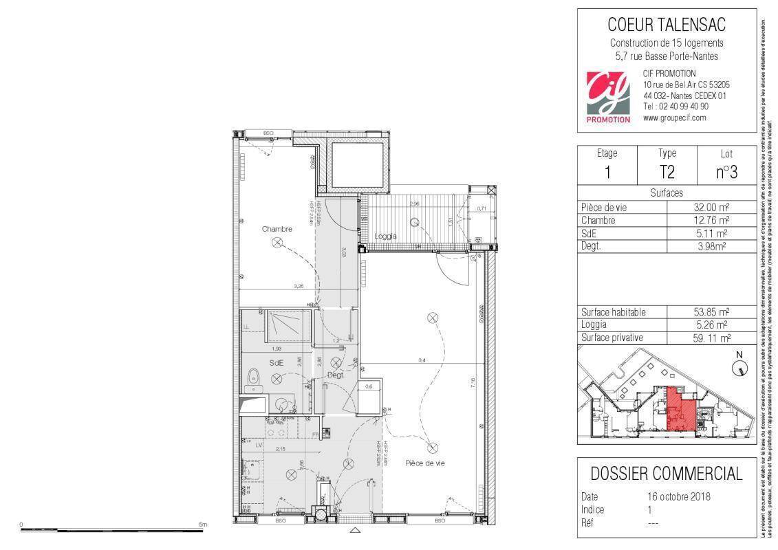 Plein centre ville, quartier Talensac, au 1er étage avec ascenseur d'une résidence récente, nous vous proposons un très bel appartement de type 2 de 53,85 m² avec balcon de 5,26 m².