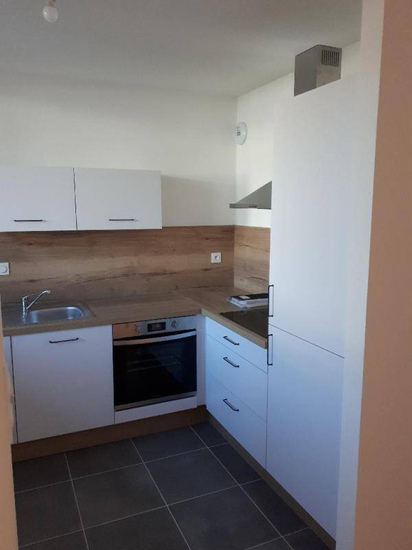 Cet appartement se compose d'une entrée avec rangement, une cuisine aménagée et équipée d'une plaque induction, d'une hotte, d'un lave-vaisselle et d'un réfrigérateur/congélateur.