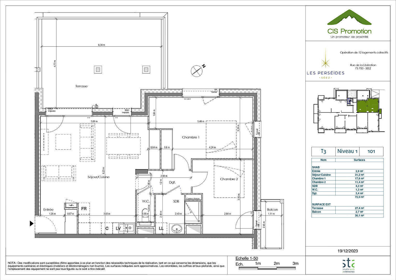 - Séjour / cuisine ouverte de 31,2 m², lumineux grâce à sa double ouverture sur une grande terrasse (27,4 m²) exposé à l'Ouest ;