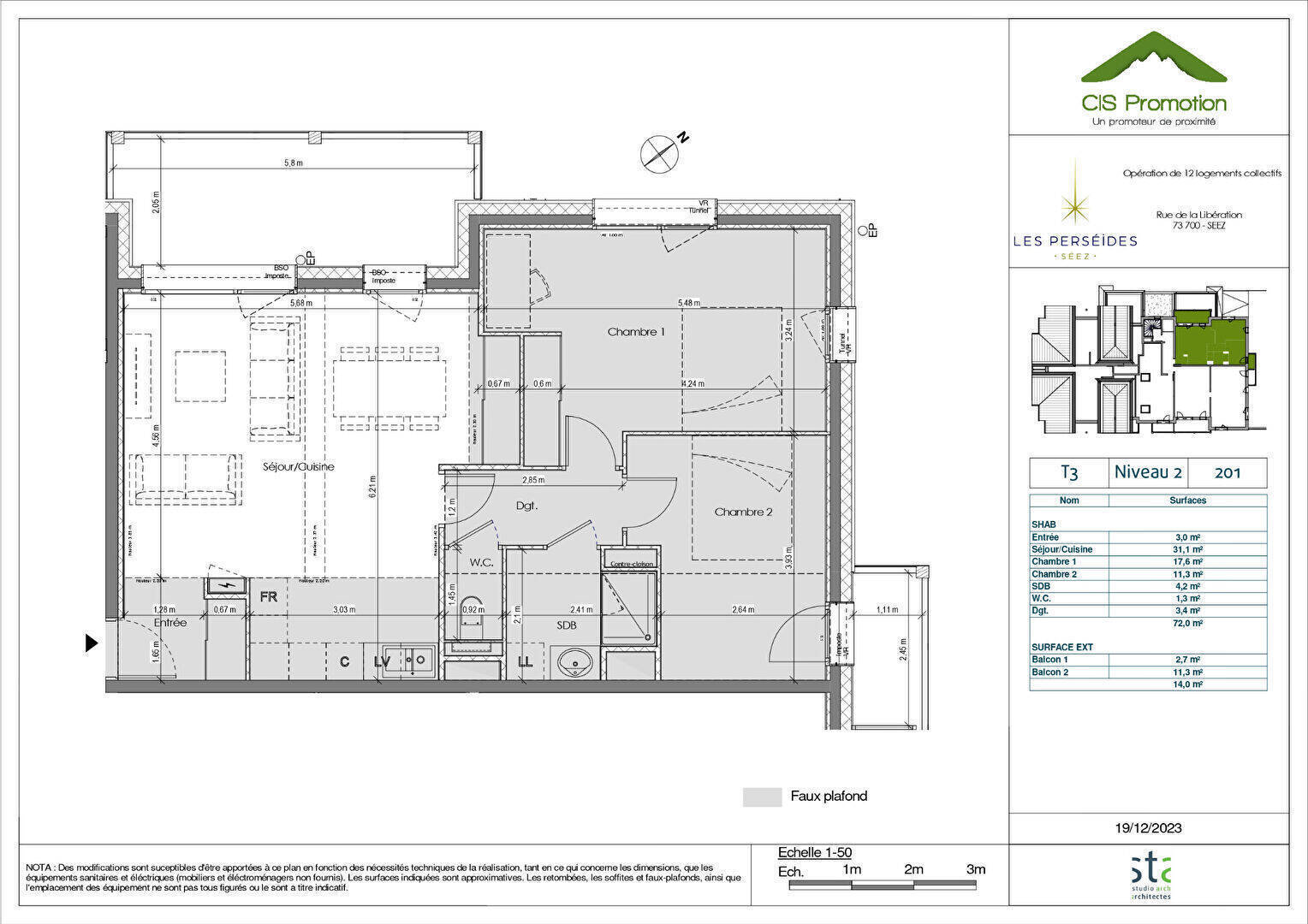 - Séjour / cuisine ouverte de 31,1 m², lumineux grâce à sa double ouverture sur un grand balcon (11,3 m²) exposé Ouest ;