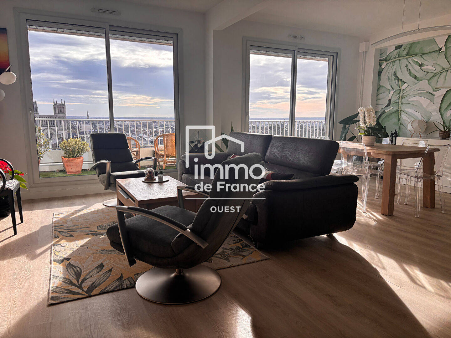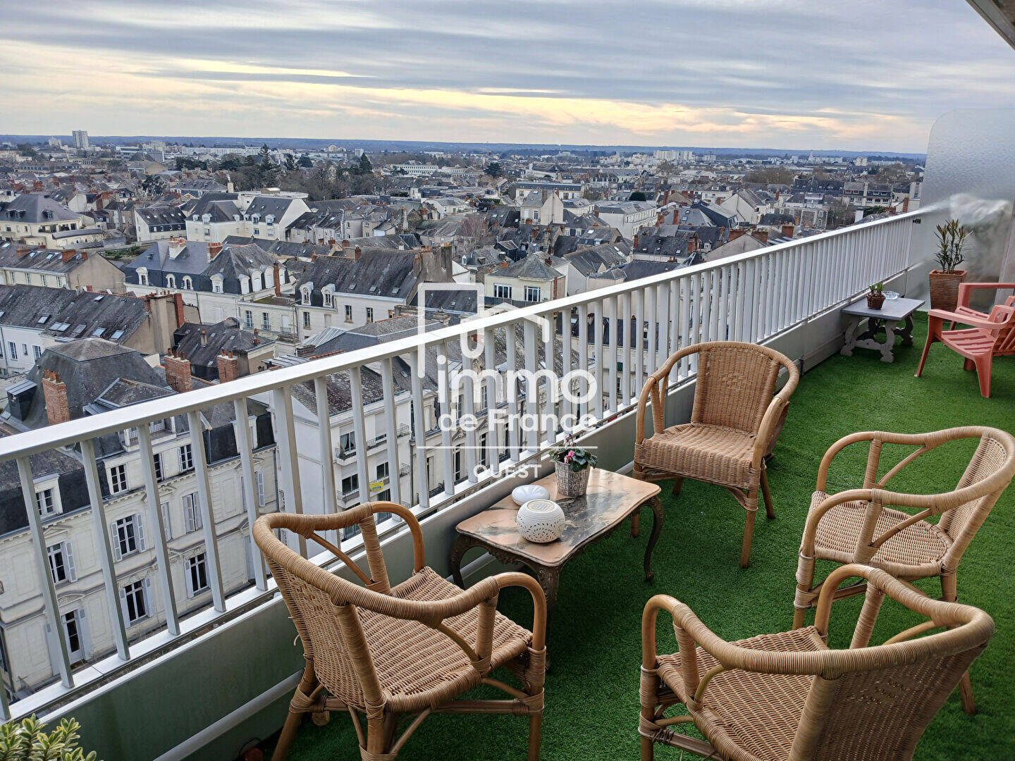 IMMO DE FRANCE VOUS PROPOSE EN EXCLUSIVITE un très bel appartement traversant de 115m² avec une vue exceptionnelle sur la ville d'Angers, vous serez séduits par ses prestations, une jolie réception avec son accès sur une terrasse exposée sud-est, une cuisine entièrement équipée avec un accès direct sur terrasse, trois grandes chambres avec chacune un accès sur l'extérieur, une salle de bains et une salle de douche, wc indépendant, nombreux rangements.