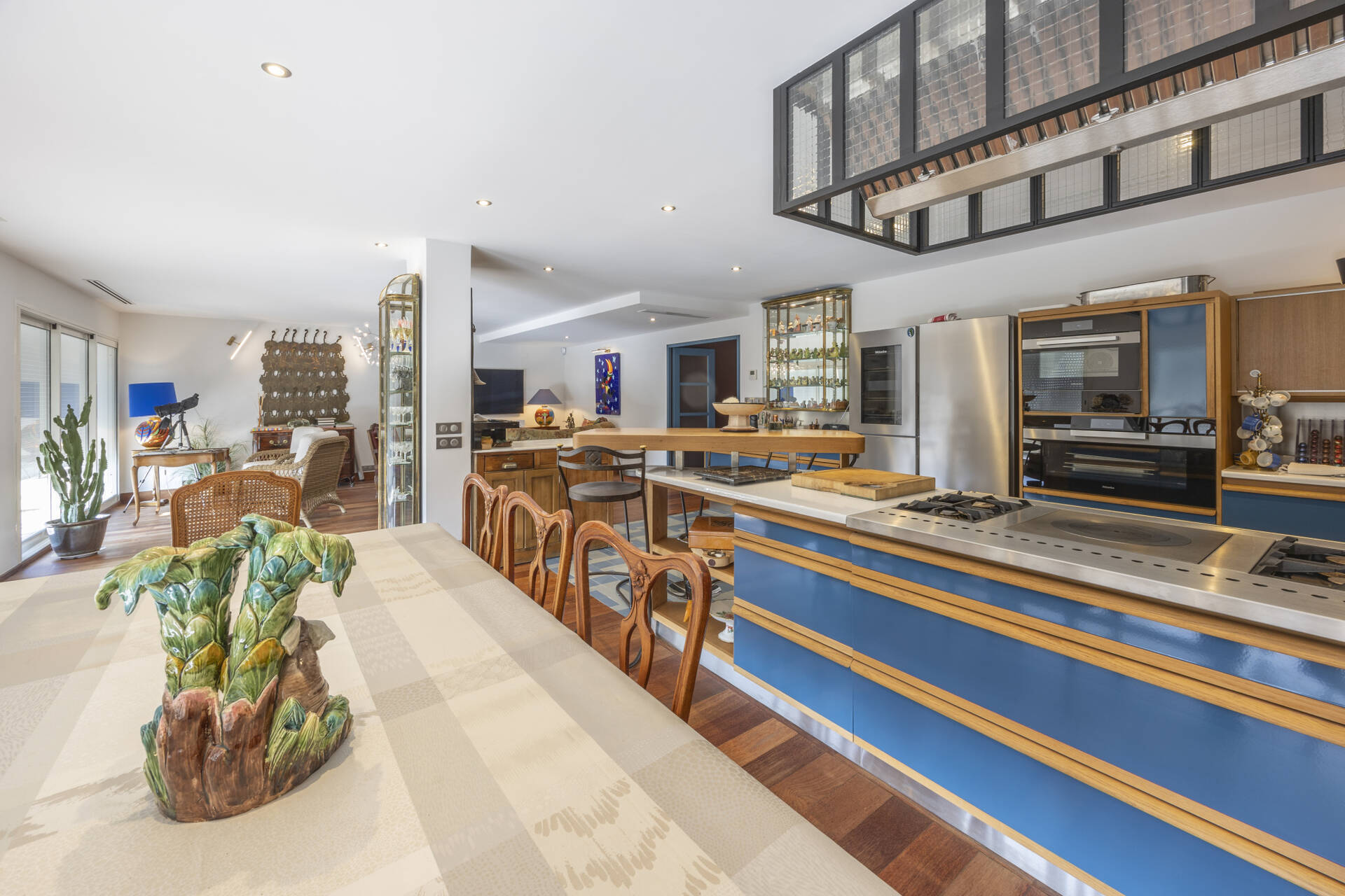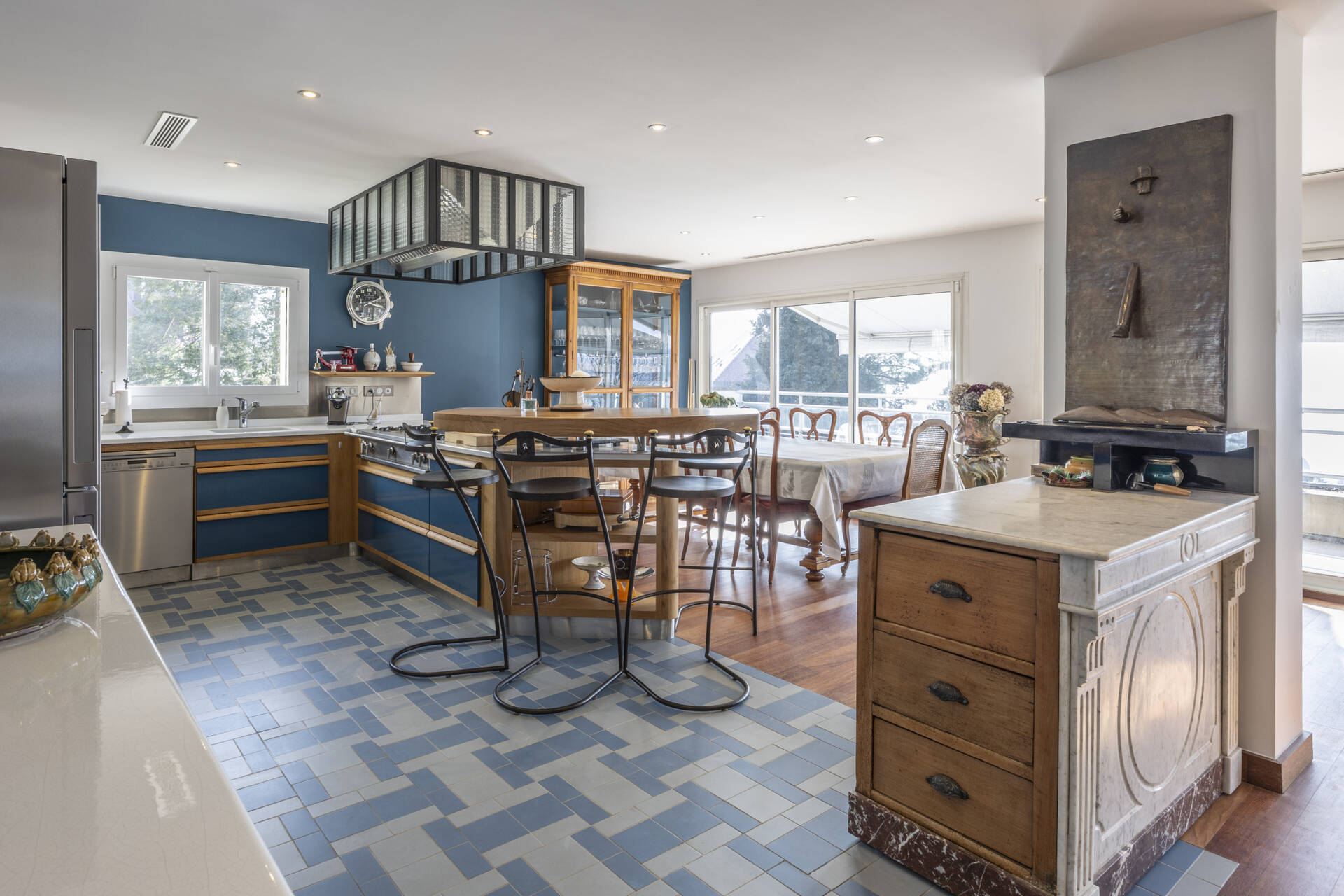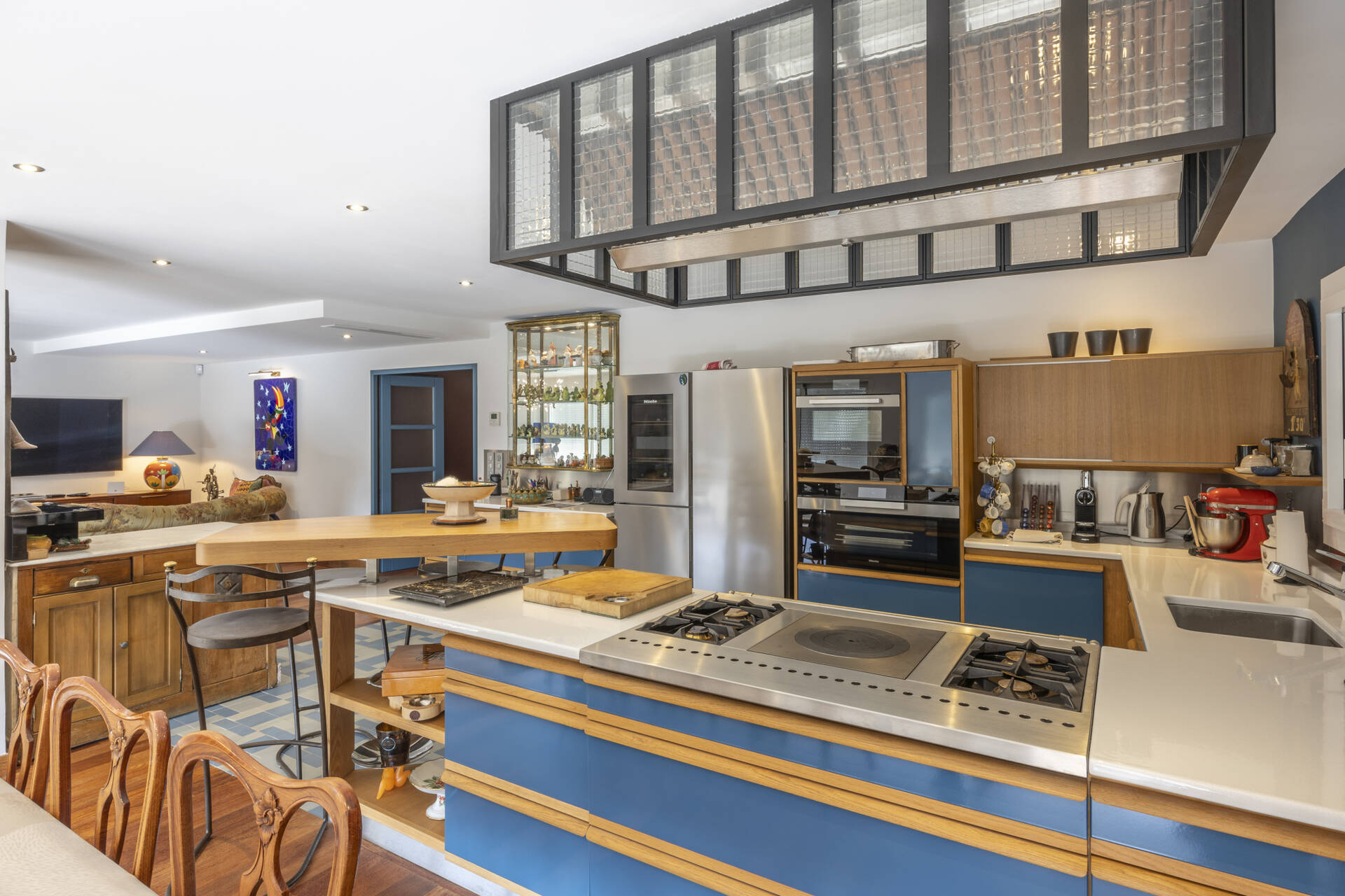 A true gem for gastronomy enthusiasts, the kitchen has been conceived as a functional work of art. Custom-designed by renowned artisans, it combines professional-grade equipment with the charm of noble materials. At its heart stands a majestic La Cornue range, accompanied by enamelled lava stone countertops and a dining table crafted from reclaimed Burgundy wine barrel staves—an exceptional testament to fine craftsmanship. Every detail has been meticulously thought out to enhance moments of sharing, balancing conviviality and sophistication.