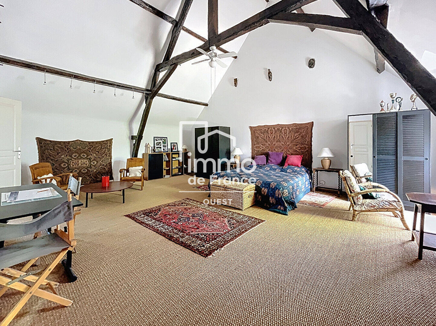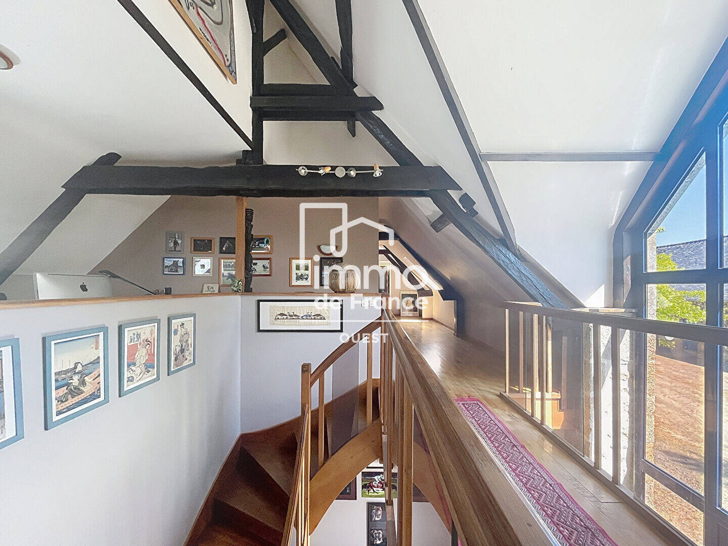 - A l'étage : un vaste palier mezzanine permet d'accueillir un confortable bureau. Le couloir dessert 3 belles chambres dont une avec sa terrasse privée, une bibliothèque, une suite parentale de 60m² et sa salle de bains, un placard, un WC.