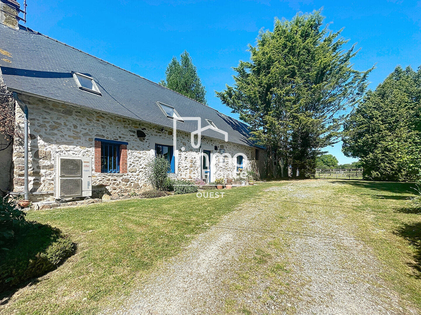 Cette longère du XVIIIe siècle, édifiée en pierre, couverte en ardoise fait face d'une part aux écuries, d'autre part à l'habitation et son joli jardin. Un environnement composé de bocage et de prairies en font l'endroit idéal pour les propriétaires et leurs chevaux.