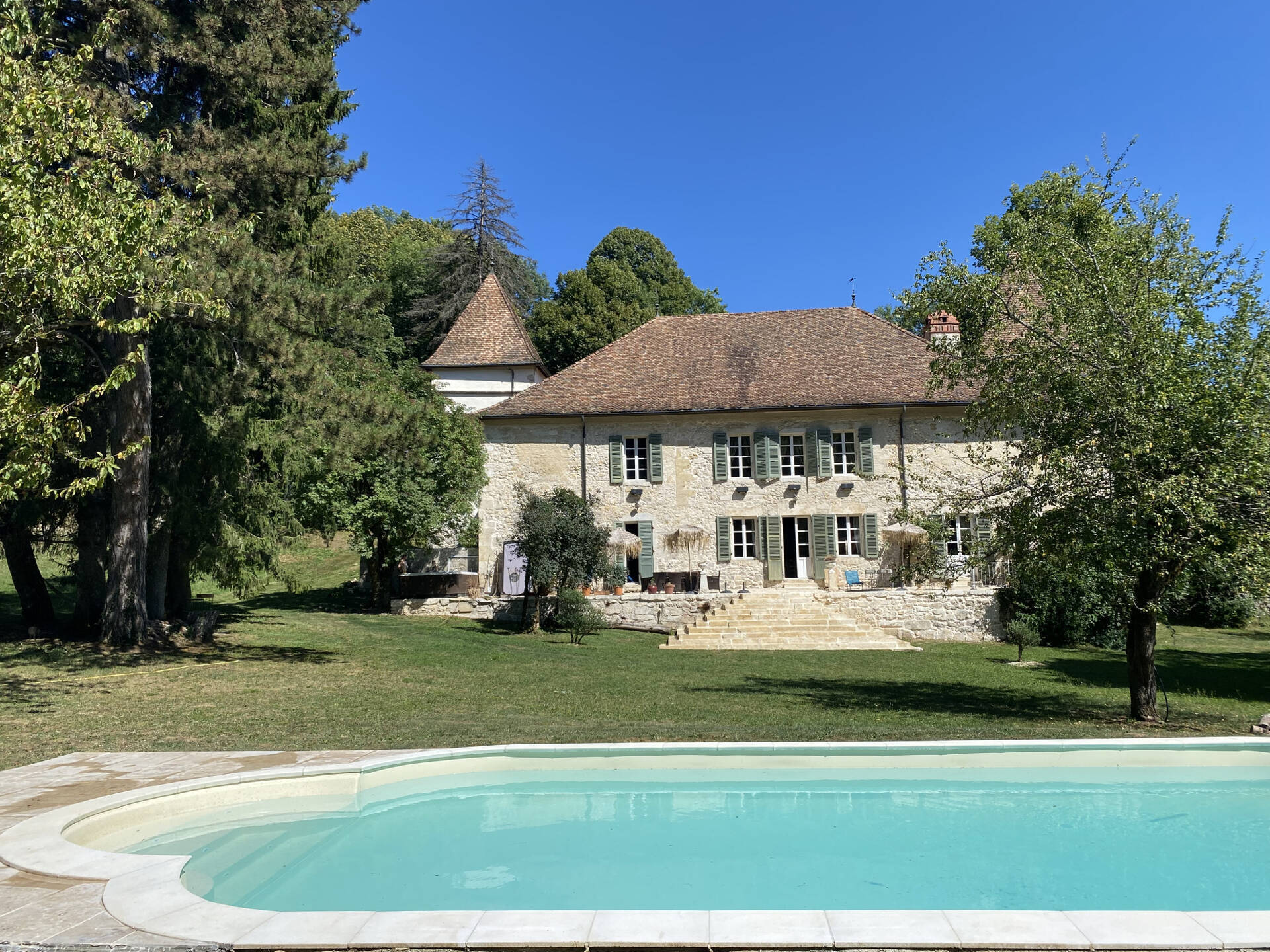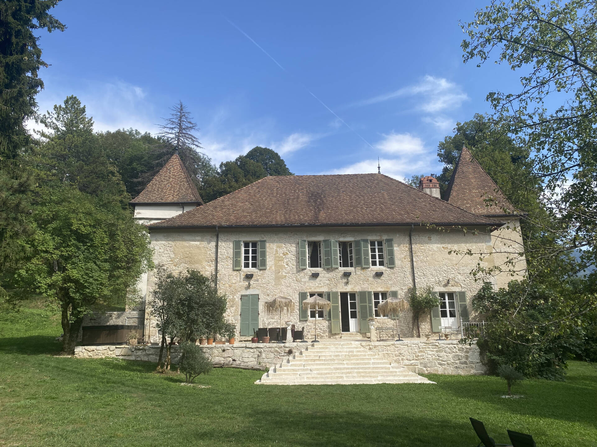 Découvrez un domaine d’exception niché au cœur du Parc Naturel Régional du Haut?Jura, à 15?min de Bellegarde?sur?Valserine (TGV, commerces, écoles), 50?min de Genève, 60?min d’Annecy et 90?min de Lyon. Sur 3,6?ha de parc, prairies et bois, se dresse un authentique château du XII??siècle offrant 550?m2 de surface habitable, où façade, toiture et charpente ont été refaites dans les règles de l’art pour préserver le caractère historique.