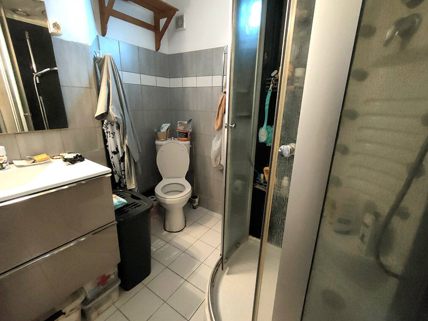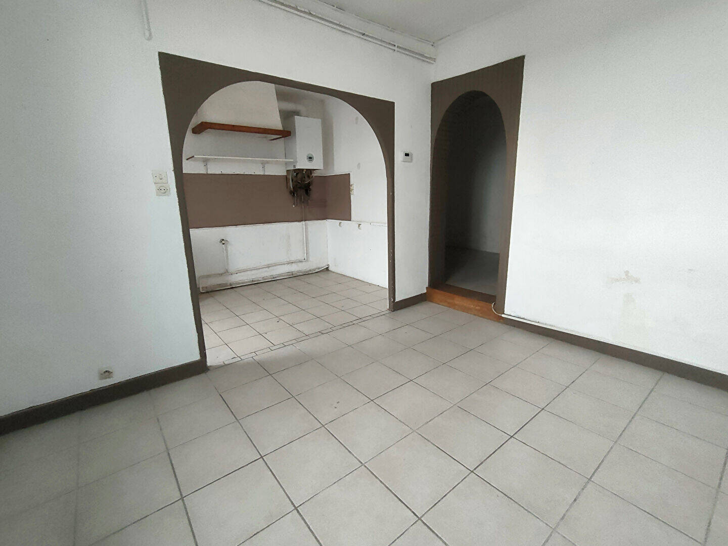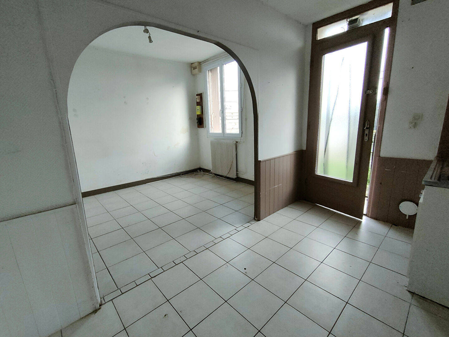 Maison de ville comprenant : pièce principale avec coin-cuisine, salle de douche avec wc. A l'étage : 1 chambre et un bureau. JARDIN ET GARAGE. Chauffage gaz de ville. A rafraichir.