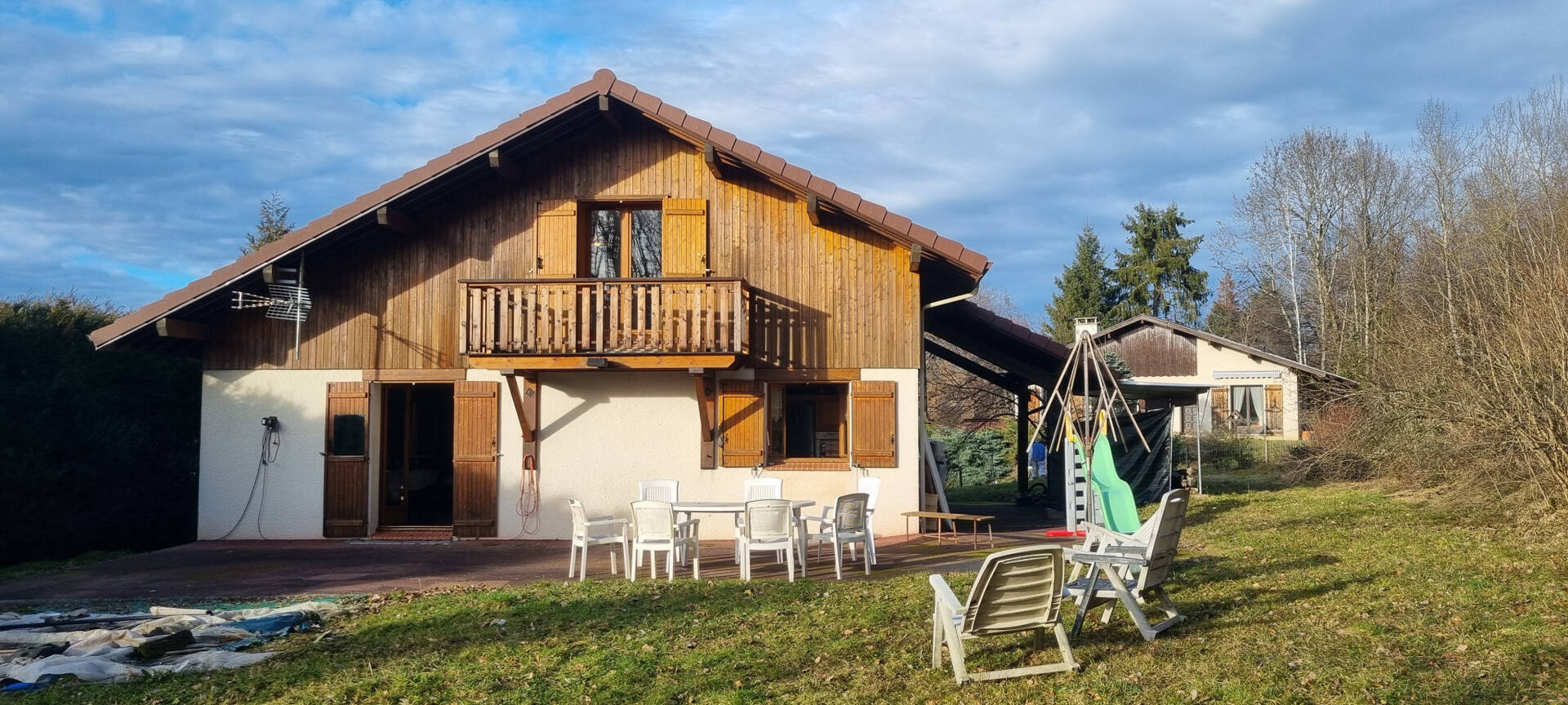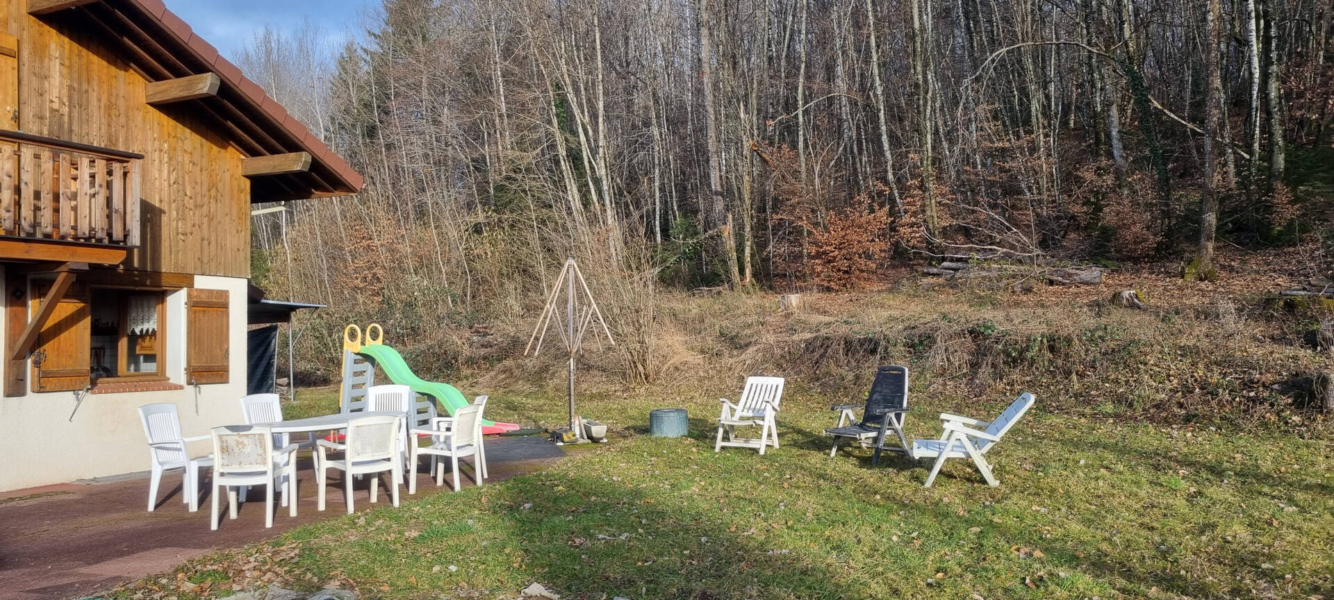 Sur un terrain jouxtant un bois paisible, maison construite en 1988, à étages comprenant au rez de chaussée hall d'entrée desservant une cuisine aménagée ouverte sur salle à manger et séjour avec cheminée insert donnant accès à la terrasse et jardin sans vis à vis, un wc séparé, une chambre de plain pied avec sa salle d'eau (douche à l'italienne), à l'étage pallier avec coin bureau, deux grandes chambres dont une avec balcon (vue jardin exposée sud), une grande salle de bains avec wc.
