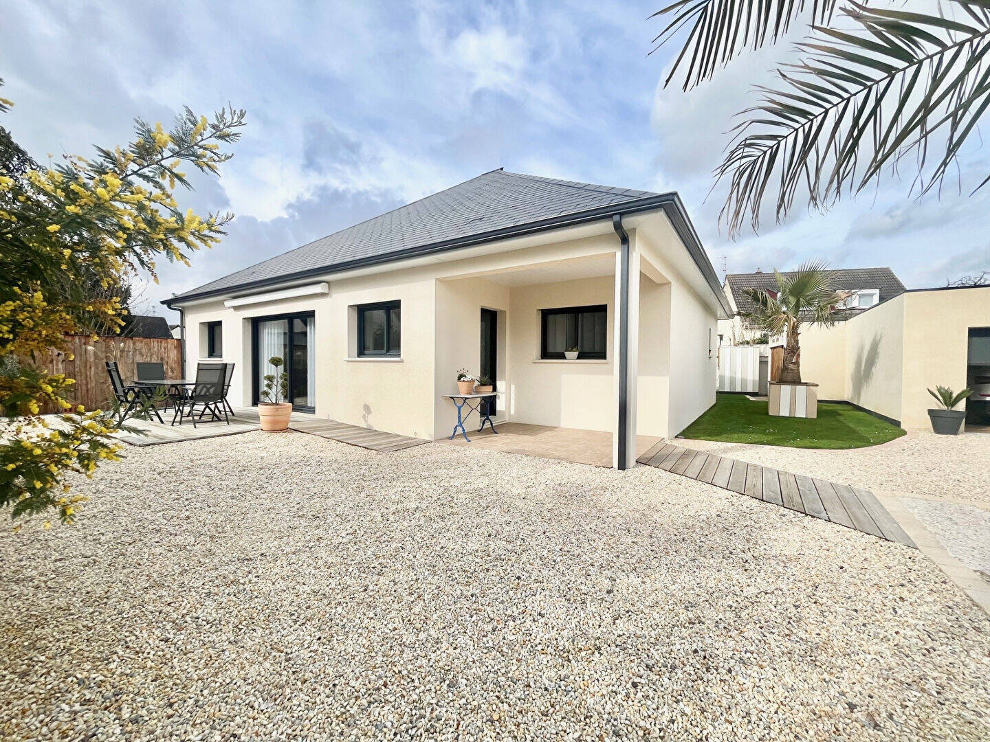 Dans un secteur très calme et paisible de la commune de Démouville, à proximité immédiate du bourg et de ses commerces ainsi que des écoles (maternelle et collège), découvrez cette maison avec un petit air de Provence, de plain-pied construite en 2024, parfaitement pensée et soignée.